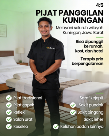 Mau pijat panggilan Kuningan Jawa Barat tanpa harus keluar rumah? Nikmati layanan massage dan urut profesional dari terapis berpengalaman yang siap datang ke rumah, kost, kontrakan, hotel, atau tempat Anda berada. Cocok untuk Anda yang merasa lelah, pegal, salah urat, keseleo, atau butuh pijat relaksasi untuk memulihkan energi dan kenyamanan tubuh setelah aktivitas padat.