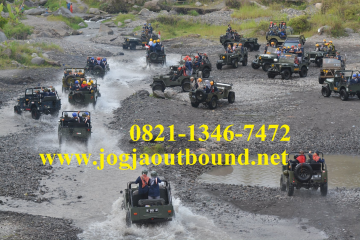 Jeep Outbound Jogja. Jeep Outbound menggabungkan dua elemen utama yang membuatnya begitu menarik: petualangan off-road dengan menggunakan Jeep dan kegiatan outbound yang memacu adrenalin. Mengendarai Jeep melintasi medan yang berat dan menantang memberikan sensasi petualangan yang tak terlupakan. Sementara itu, kegiatan outbound seperti hiking, rappelling, dan berkemah menambahkan dimensi baru dalam menjelajahi alam. Paket Team Building outbound Di Merapi dimulai dengan Kegiatan Ice breaking dan Grouping di lokasi Outbound yang ditentukan, setelah kurang lebih melaksanakn Ice Breaking 1 Jam peserta di bagi group dan naik Jeep menuju lereng merapi. Ada bebrapa pos yang harus di singai setiap Group dan setiap group harus menyelesaikan tantangan yang ada di setiap Pos. Setiap Pos ini lokasinya merupakan lokasi favorit wisata Lava Tour merapi misalnya Museum Sisa hartaku, Batu alien, Bunker Kaliadem dan Kali kuning. Jadi selain peserta diajak untuk meningkatkan kekompakan, kedisiplinan, fokus, juga diajak refreshing menyelesaikan tantangan yang disediakan di setiap Pos.