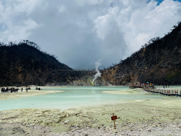 Kawah Putih merupakan kawah vulkanik dengan danau berwarna hijau toska yang menawan, dikelilingi oleh tebing-tebing kapur putih yang menambah pesona alamnya.